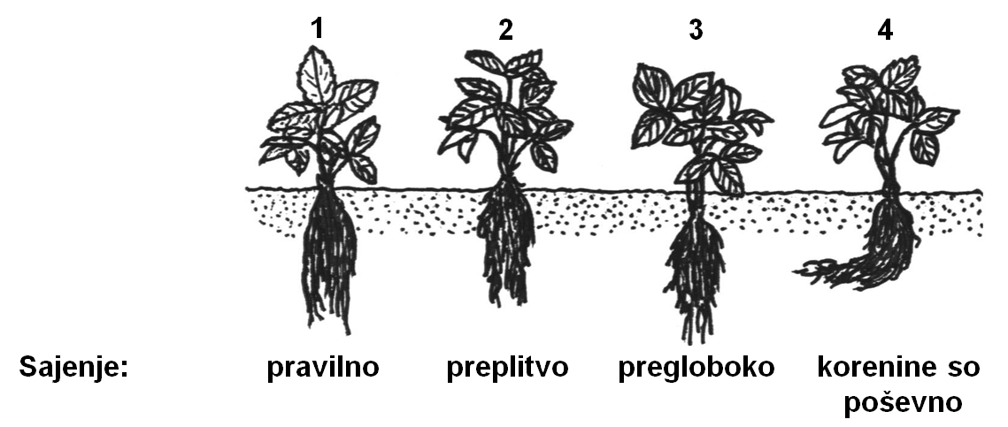 Pri pravilnem sajenju rastlin (skica 1-koreninska brada mora biti navpično pod rastlino in koreninski vrat mora biti pokrit z zemljo) lahko cca. 14 dni po sajenju gnojimo s 300 – 400 kg/ha Apnenega dušika na suhe rastline, vendar na še vlažno zemljo. Tla morajo v tem času že biti uležana, da so korenine rastlin dobro zaščitene. Če so rastline posajene preplitvo (skica 2), pregloboko (skica 3) ali da koreninska brada poševno lahko apneni dušik poškoduje frigo sadike.