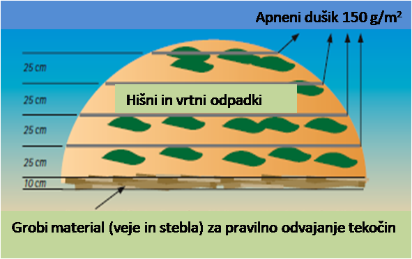 Nasvet: Kuhinjske in vrtne odpadke nalagamo v plasti v višini cca. 25 cm. Na vsako tako plast enakomerno potrosimo 150 g/m2 apnenega dušika. Ko kup doseže višino 1 m, ga prekrijemo s tanko plastjo zemlje.