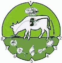 Cerkarije plavajo naokoli in se pritrdijo na bilke trav in se spremenijo v ciste. Živali se okužijo, če jedo travo ali seno in pijejo vodo, ki vsebujejo ciste.